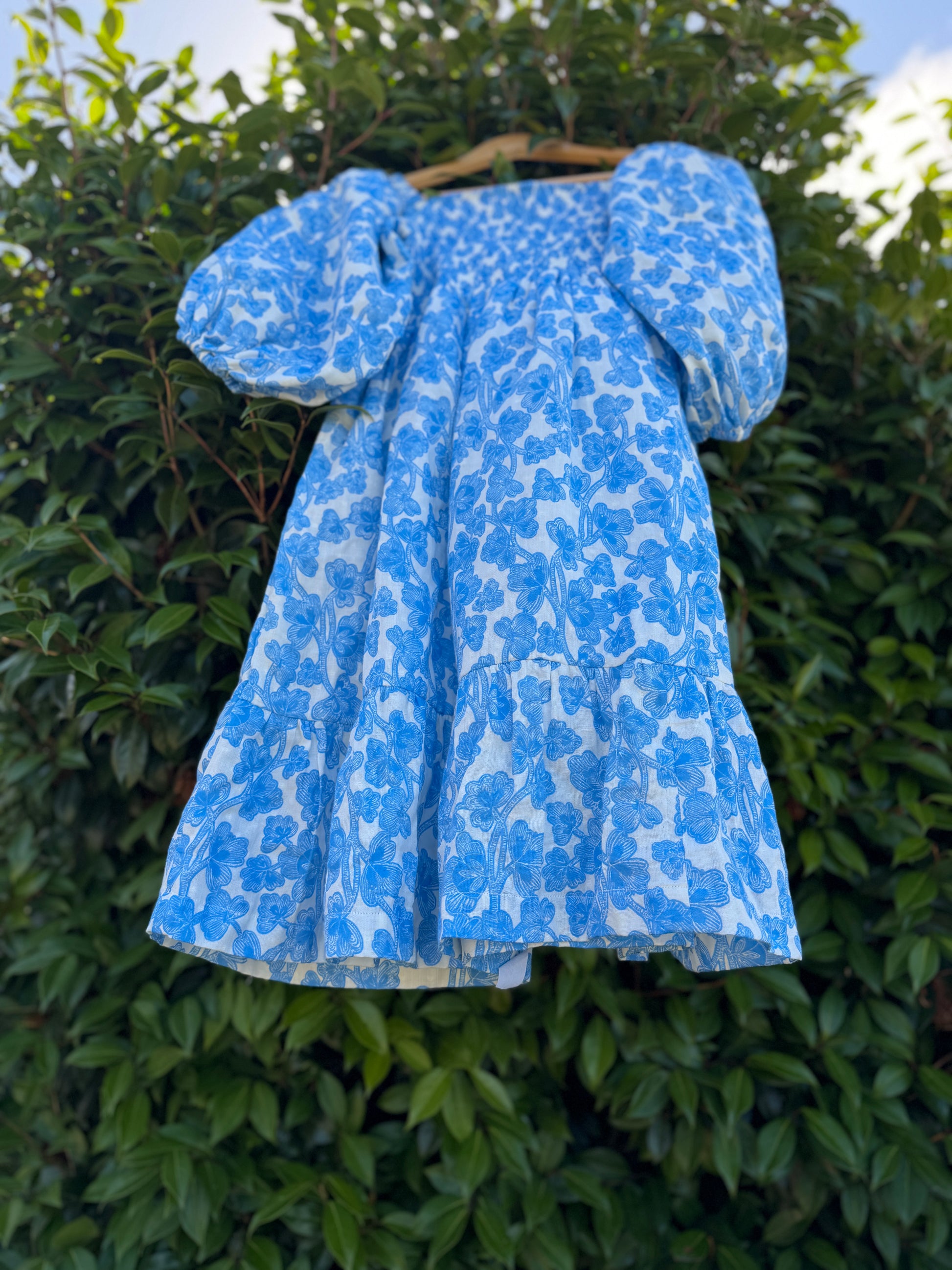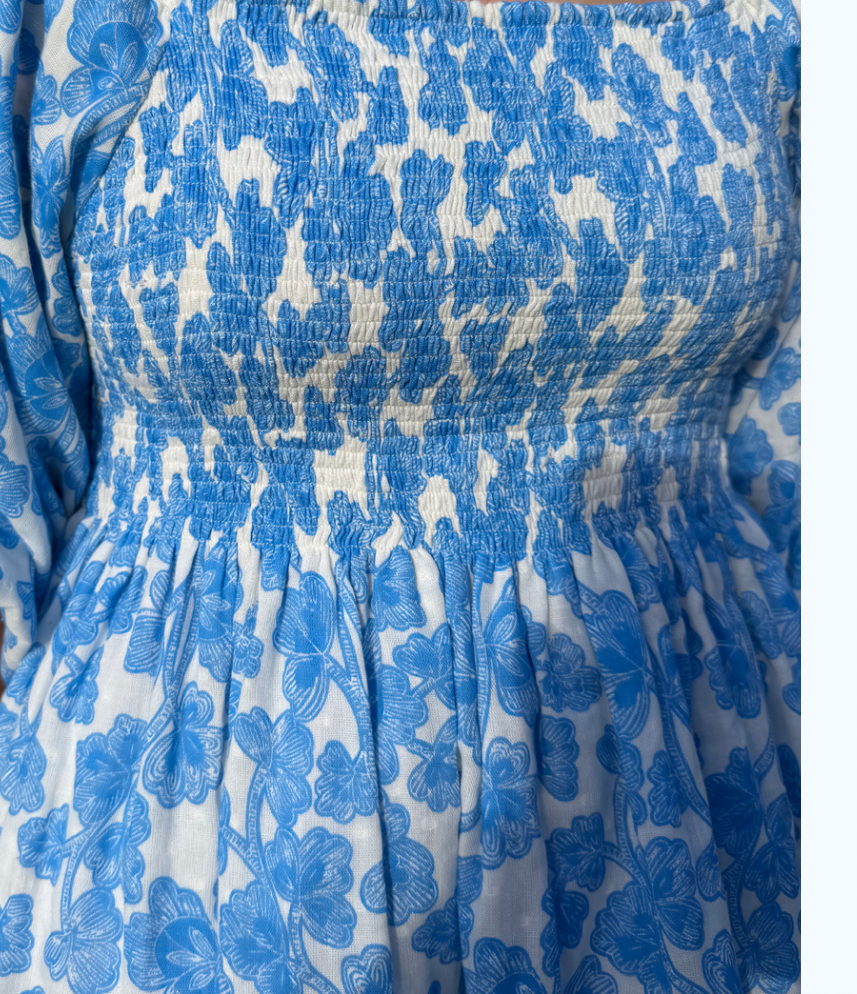 A celebration of soft florals and effortless charm, the Bluebell Bloom dress features delicate blue blooms on breathable cotton. With its smocked bodice, romantic square neckline, and gentle gathers. Fully lined with premium 100% cotton